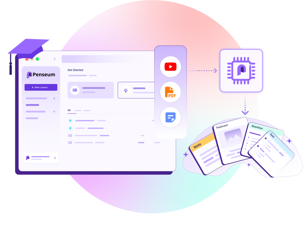 Tu peux importer tout type de matériel d’étude : PDF, notes de cours, diapositives, etc. Penseum générera automatiquement des outils d’apprentissage à partir de ton contenu.