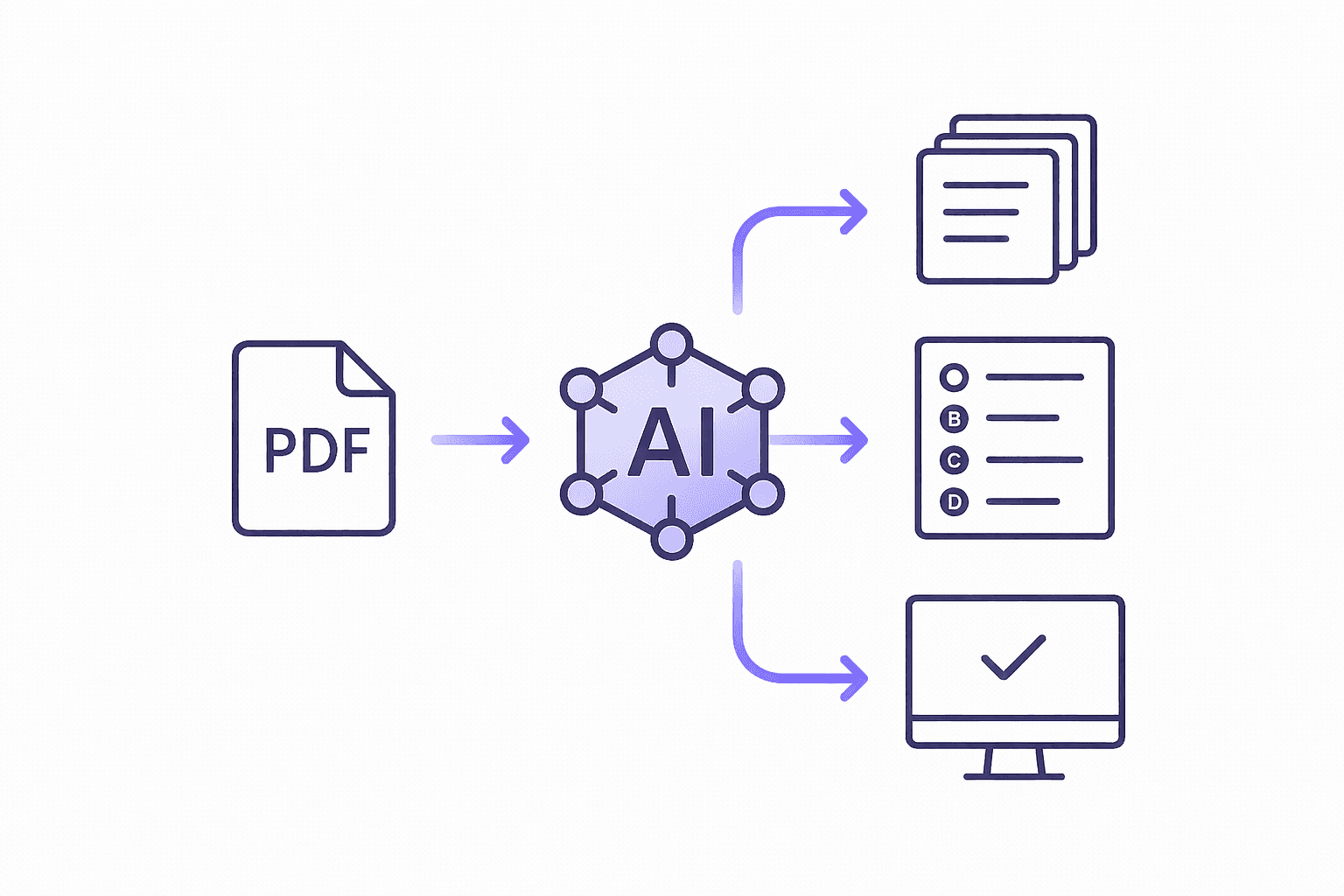 Penseum's AI engine works differently. Upload any PDF, lecture slides, textbook chapters, research papers, and the system instantly transforms content into flashcards, questions and answers, tailored exams, and byte-sized lessons. No waiting, no manual processing.